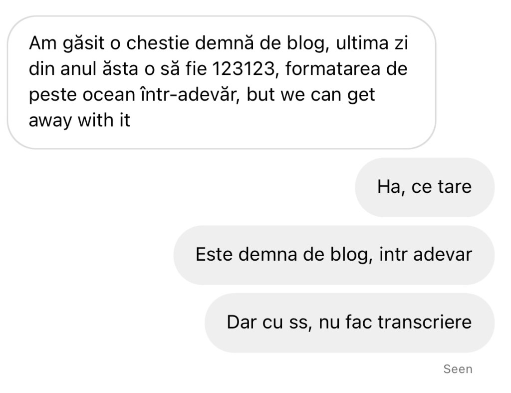 08:14 ah, si cand sunt nedormita eu vorbesc mult. in cazul de fata scriu mult. si ce voiam sa zic este ca am un task de vreo saptamana care ma bantuie – ma trezesc dimineata si ma gandesc la el, mananc la pranz si imi sta in gat mancarea, beau a 5-a cafea pe dupa amiaza si tot la task-ul asta imi sta amareala pe limba, adorm cu el in gand si pe retina, abia astept sa se termine, sa se duca valul asta de grija de deasupra capului