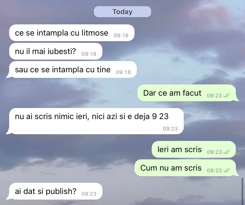 18:35 s a schimbat programul la glutes. Yes, it’s worse. Cand am intrat, un tip le a certat iara pe doamnele de la receptie ca nu merge scara rulanta. Dar ai venit la sala, dude. E un tip la bodypump care inainte de clasa vorbeste cu toate fetele. Are dread-uri, ii ajung pana la fund. Dupa 30 de minute de glutes aveam 21 de notificari, un nou grup de whatsapp format, 2 apeluri pierdute si un photo memory de la tulcea de acum un an sau 2. Nu am sunat pe nimeni inapoi si nici nu am dat cu seen – ca mi am scos bifele albastre de la whatsapp