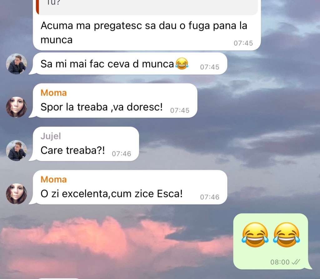08:02 dimineti de vineri pe grupul de familie (context: fratimiu se plangea mai sus ca nu are treaba si ca se duce totusi pana la laborator, iar maicamea se crede Andreea ESCA. eh, atunci cred ca ii iau si eu locul lu’ Alexia Eram)
