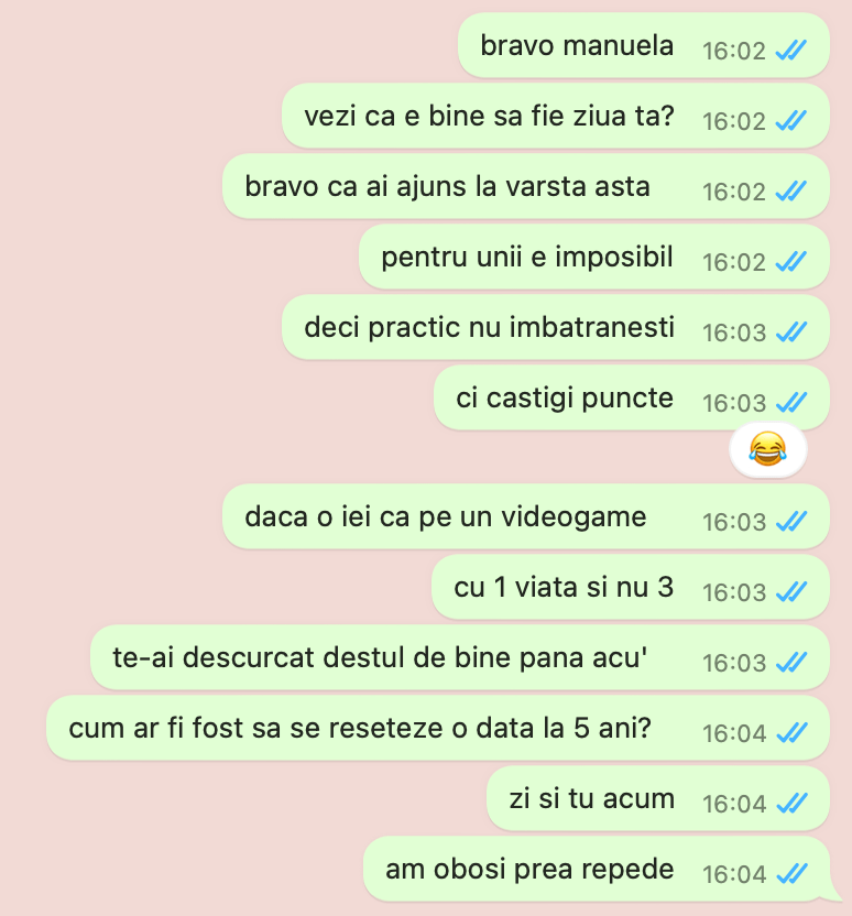 20:30 cu toata urarea cu tot, mai faceam si brainstorming dinasta de idei cu ce sa faci naibii si in orasul asta si istoricul mi a spus ca uneori trebuie sa fiu recunoscatoare pentru oamenii din zilele mele si pentru zilele pe care oamenii mi le au daruit. Si toate momentele care au transformat o zi banala intr una pe care o sa mi o mai amintesc ceva timp se acum incolo
