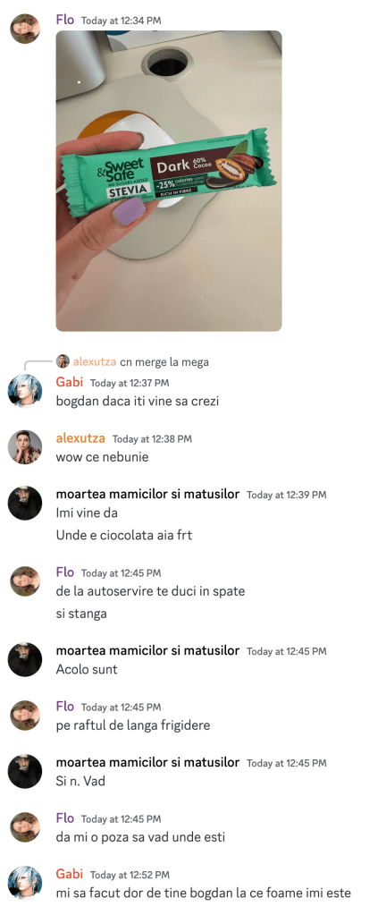 13:03 bogdan in birou de la mega image, am luat banane. Zic, da’ de ce? Pentru proteina.