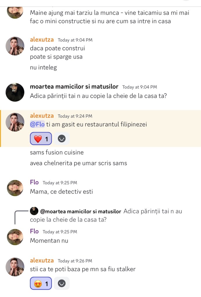 21:43 a new crazy crazy stalker. avem asa: glumita, restaurant gasit de alexandra, informatie cheie, confirmare stalker