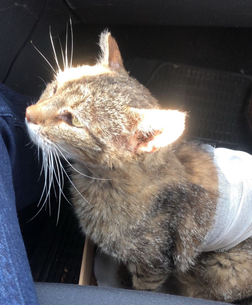 mai jos, in masina, probabil primul lui drum cu masina, bandajat de dupa cine stie ce lupte, e dus de ai mei la ramnic, la veterinar, poate, poate, poate mai gasim pe undeva o viata uitata printr-un sertar al vreunei mustati