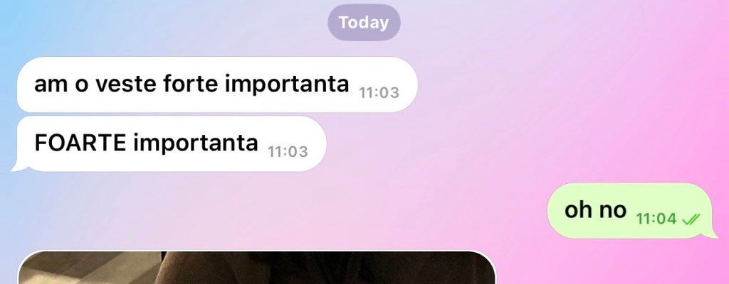 #2229 Flo Uncategorized April 29, 2026April 29, 2026 1 Minute 10:59 prin birou, ce faci, Momo, cum esti? Astept feedback din afara persoanei mele 11:07 ma ia cu inima asa de dimineata Share this: Share on X (Opens in new window) X Share on Facebook (Opens in new window) Facebook Like Loading... Published by Flo View all posts by Flo Published April 29, 2026April 29, 2026