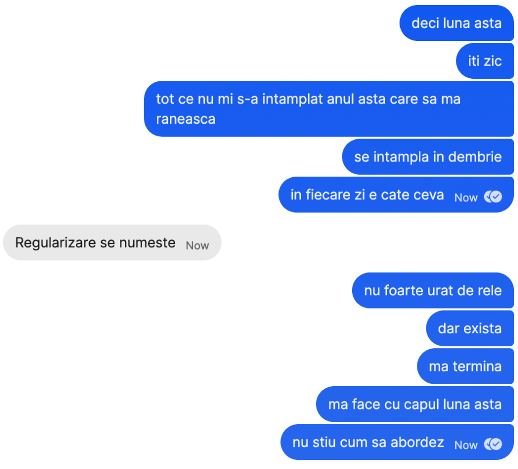 21:37 acum in preajma sarbatorilor de iarna, momentul in care trebuie sa fim mai buni, vreau sa imi cer scuze tuturor celor carora le-am mancat mancarea, celor carora nu le-am dat banii pe shoturi a doua zi, celor carora le-am dat spoilers, celor carora le-am dat cu seen pe whatsapp pana mi-am scos semnalizarea aia de citit mesajele, dar mai ales celor carora nu le-am raspuns nici pana acum la mesajele de la multi ani de pe 5 mai sau mai rau! De la florii. The end.