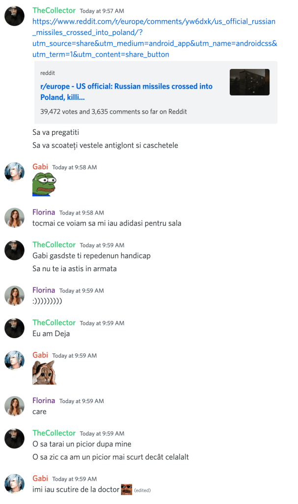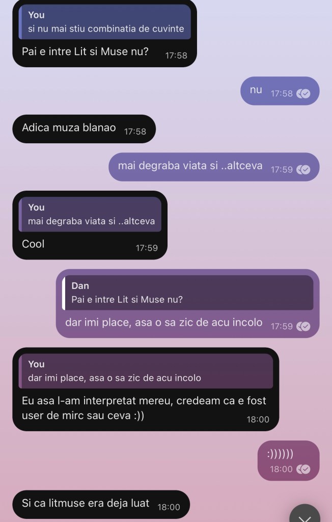 11:26 buna dimineata la toata lumea si la toata planeta, sa fie cu noroc si veselie, va pup, la 1 am plecat, dar iau laptopul dupa mine, dar la bogdan in ghiozdan