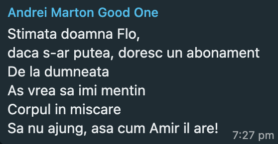 17:37 acum mi-am dat seama cum am ajuns sa mananc cartofi prajiti de la McDonalds azi. am deschis intre show-uri, la minutul 10 Teo zice de Only murders in the Building, ii zic lui Bogdan, zice da, am vazut, l-am ascultat de dimineata, ajung la minutul 17, astia 3 fac ditamai comanda la Mc si se hlizesc incontinuu. get it?