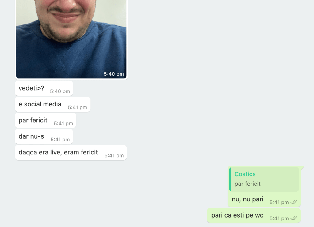 13:52 maine eu intru in depresie daca incepe ploaia. bogdan: ce vrei sa faci? sa intru in depresie. ploua, azi am fost in hanorac la magazin. bogdan: si iti permiti?