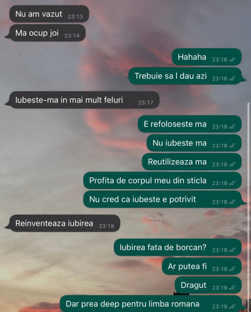 17:07 ma simt bine, matei mi-a spus ca arat diferit intr-o poza de acum 10 ani. am subliniat imbatranita, mi-a spus nu, diferita. lovely.