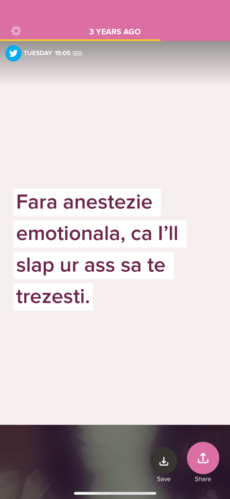 17:46 cand mergeam cu autobuzul aveam timp sa ma plictisesc si sa ma linistesc. In statie asteptand sau in bus sufocandu ma, vara de caldura, iarna de aglomerat ce era. Acum cand plec de acasa nu mai iau in considerare transportul in comun, trebuie sa ajung repede oriunde ar trebui sa ajung, trebuie sa ma uit pe aplicatie cat fac pana acolo sau unde e cea mai apropiata masina de inchiriat. Ma urc, ma uit pe harta, ajung, ma enervez in trafic si ma mai enervez inca o data la parcare, si promit din nou, ca nu mai merg niciodata cu masina in timpul saptamanii la ore de varf