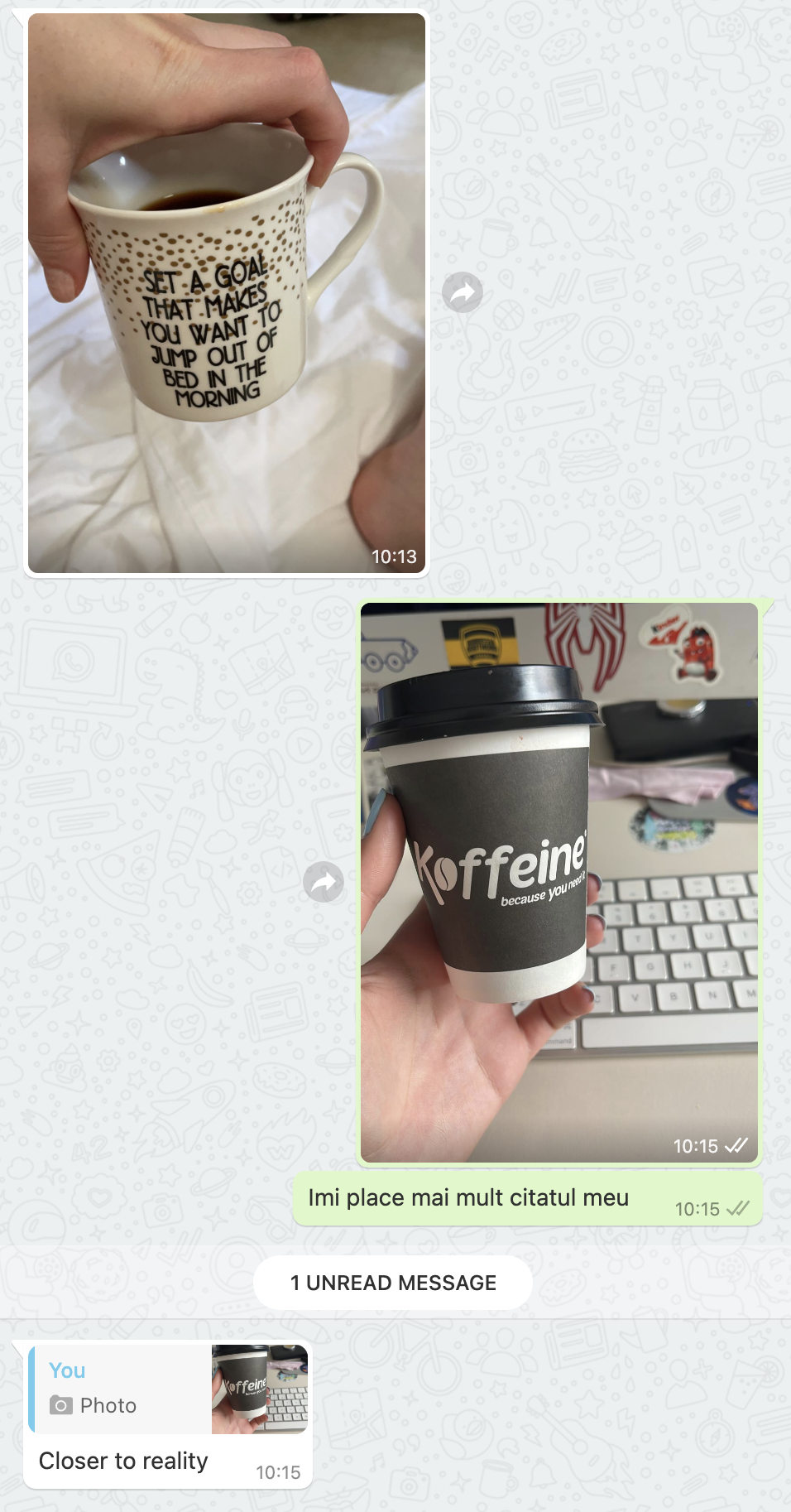 00:09 good notification. am but o cafea pe la 10, sper sa mai rezist o ora treaza după ziua asta trăită intens mahmura.
