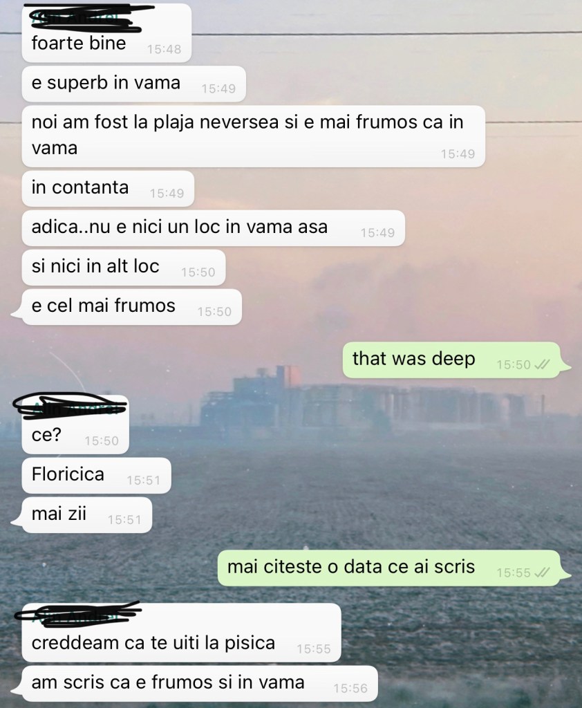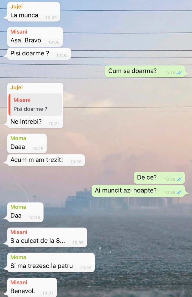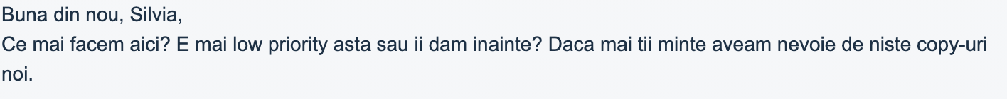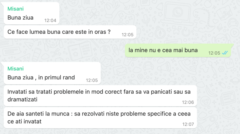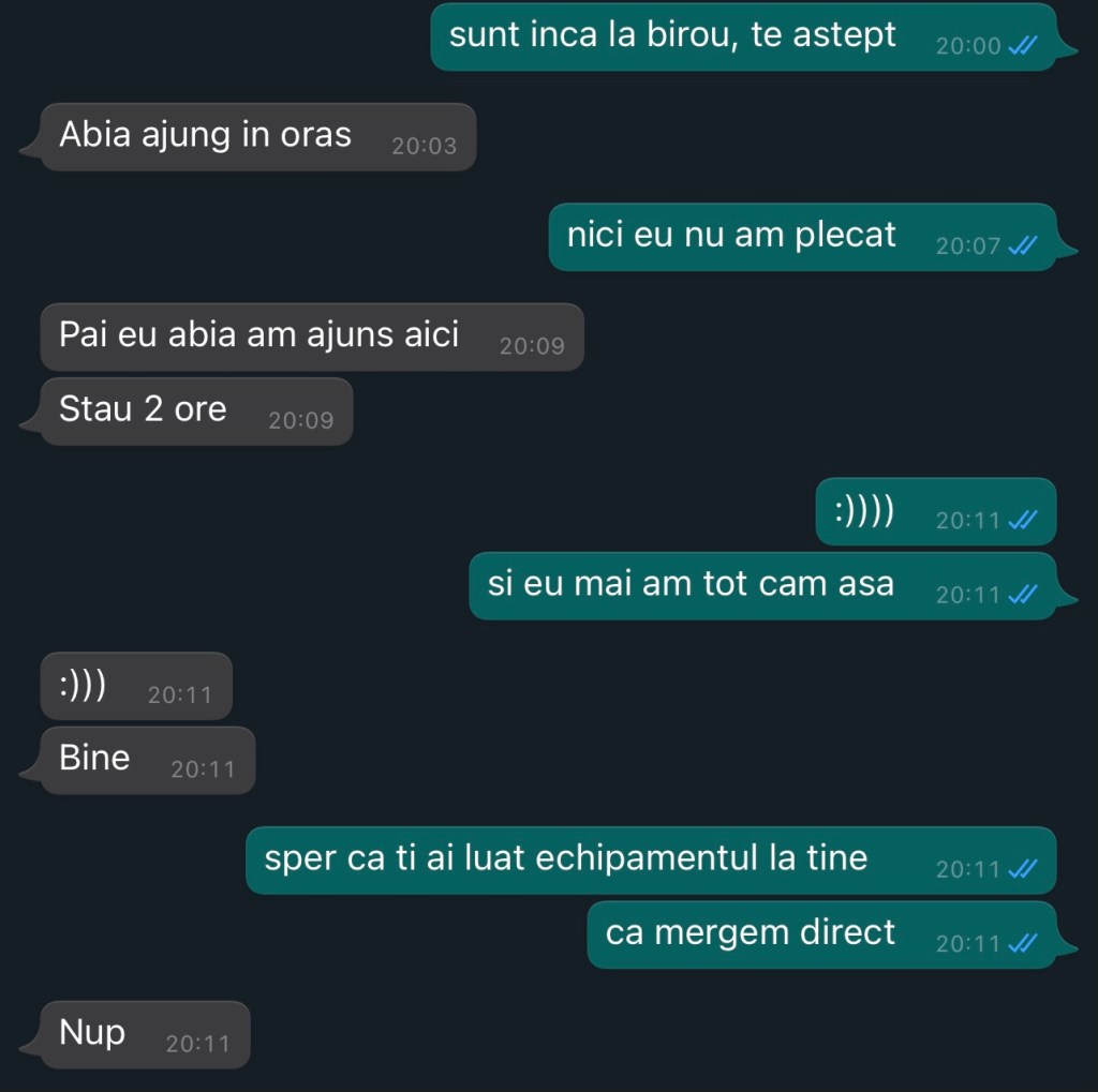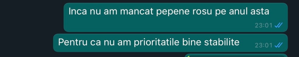 14:48 cumva am ajuns la concluzia ca aș putea fi o persoana mai buna, care sa nu judece prea mult și care sa fie super simpatica cu majoritatea oamenilor, însa cumva m-am grăbit și am încercat sa incep aceasta schimbare astăzi. astăzi, când Bogdan are de predat un logo, astăzi, când Octav nu știe sa facă o anexa, astăzi când am primit o suta de mailuri și la 50 am ceva de comentat, astăzi când mi se pun întrebări cu “de ce” în fata.