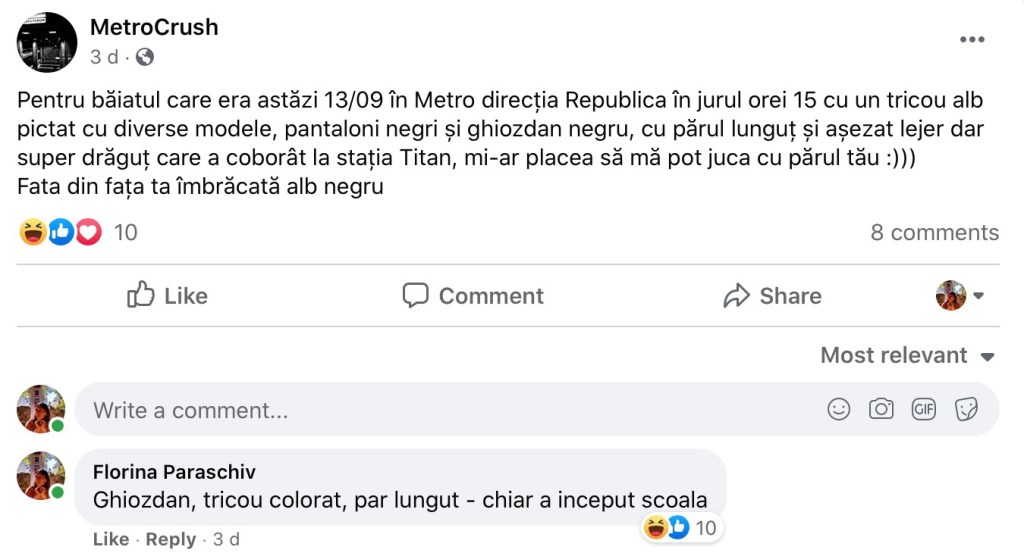 10:06 Pe metrocrush again: Pentru băiatul care era astăzi 13/09 în Metro direcția Republica în jurul orei 15 cu un tricou alb pictat cu diverse modele, pantaloni negri și ghiozdan negru, cu părul lunguț și așezat lejer dar super drăguț care a coborât la stația Titan, mi-ar placea să mă pot juca cu părul tău :))) Fata din fața ta îmbrăcată alb negru” Ghiozdan, tricou colorat, par lungut – chiar a inceput scoala